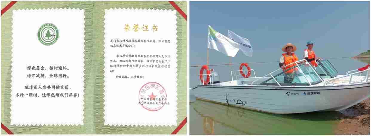 2024年6月,,,,公司攜手中國綠色碳匯基金會,,,開展“保衛(wèi)江豚”公益活動,,,,向基金會捐贈人民幣20萬元用于采購全新巡邏艇,,,以支持鄱陽湖長江江豚保護工作。。。截至2024年底,,公司捐贈的資金與巡邏艇已經(jīng)有效協(xié)助巡護隊對鄱陽湖1,667頭江豚開展保護行動。。。