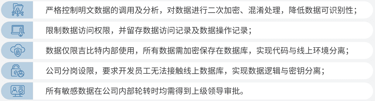 公司對用戶個人信息實施脫敏處理,,,嚴格限制用戶信息用途,,,,數(shù)據(jù)使用完成后集中歸檔處理。。為進一步確保數(shù)據(jù)處理過程的安全,,公司根據(jù)實際的業(yè)務(wù)工作分崗設(shè)限,,最大程度保護數(shù)據(jù)隱私安全,,,如在生產(chǎn)網(wǎng)絡(luò)中的加密數(shù)據(jù)由研發(fā)部門員工負責(zé)編寫加、、、解密程序,,但其無法直接訪問到加密后的數(shù)據(jù)庫;程序的加、、、解密密鑰由運維員工單獨配置。。。